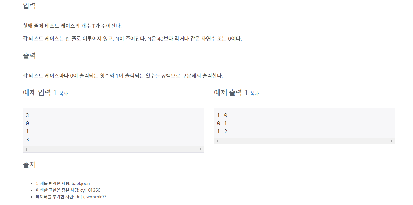 피보나치 함수(n) 일때 0과 1이 각각 몇번 출력되는지 알아보는 함수 입니다.