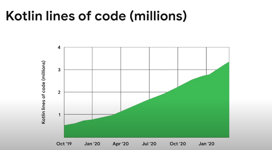 - 구글 플레이 상위 1000개의 앱을 기준으로 통계를 내본 결과 1000개 앱중의 80%가 코틀린 코드로 작성