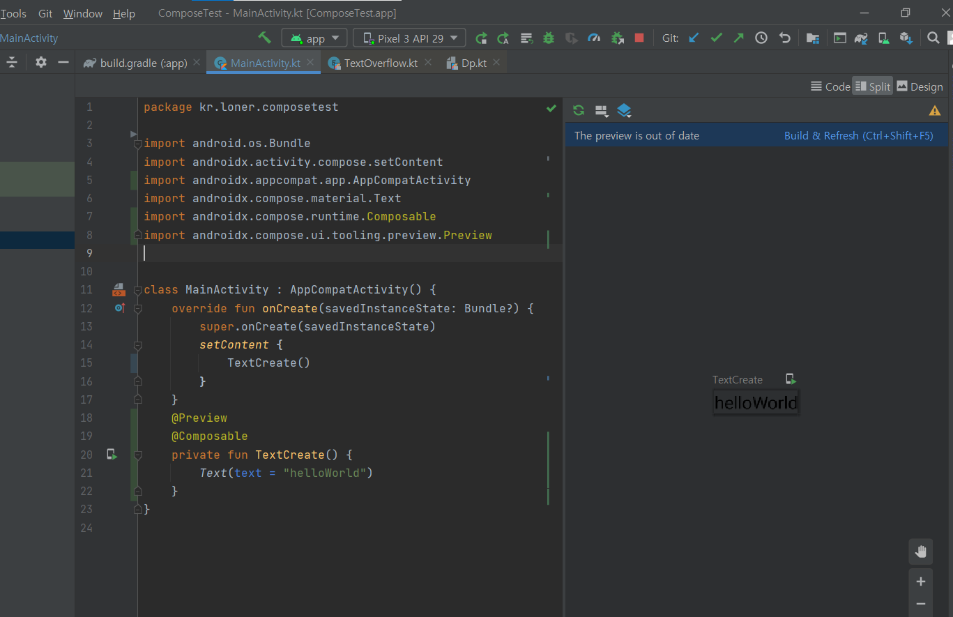 만드려는 UI를 미리 보고자한다면 @Composable 위에 @Preview 를 사용하면 됩니다.