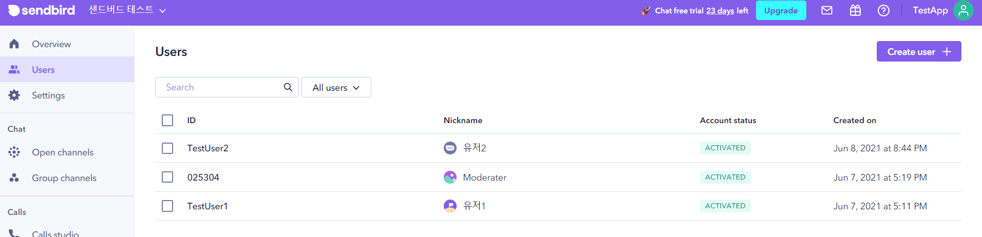 우측 상단에 CreateUser + 를 눌러서 TestUser1, TestUser2 를 만들어 줍시다.