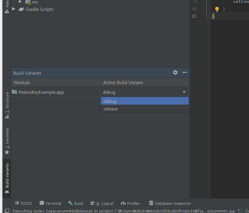 안드로이드 좌측 하단에 Bulid Variants 라는 탭을 누르면 위같은 창이 뜹니다.