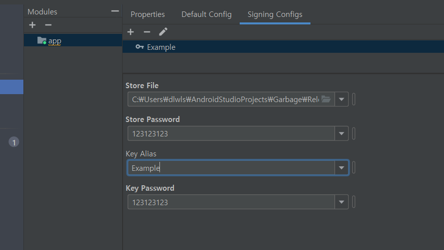 - 선택했던 .jks 파일의 Password와 KeyAlias를 입력해줍시다.