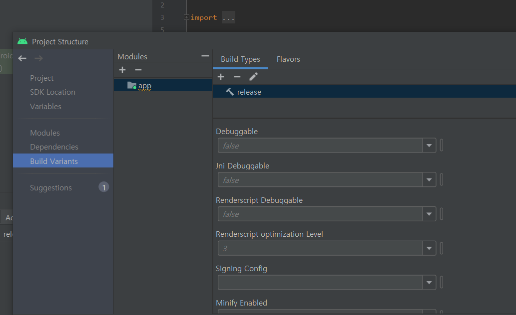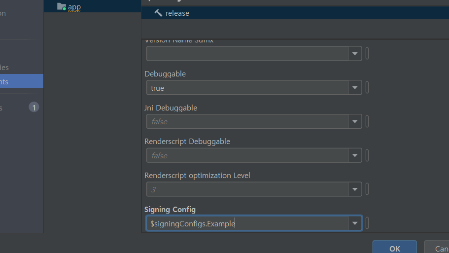 - Debuggable를 true로 바꿔주고 Signing Config를 설정해 줍니다.
