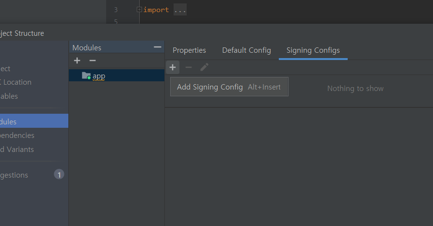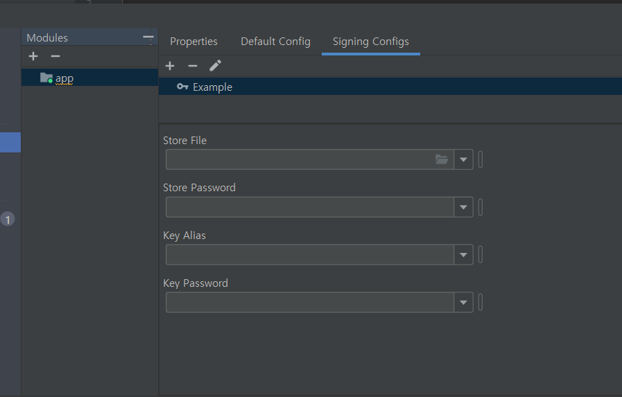 그럼 위 같은 화면이 나오는데 Signing Configs 탭을 눌러서 + 버튼을 눌러줍시다.