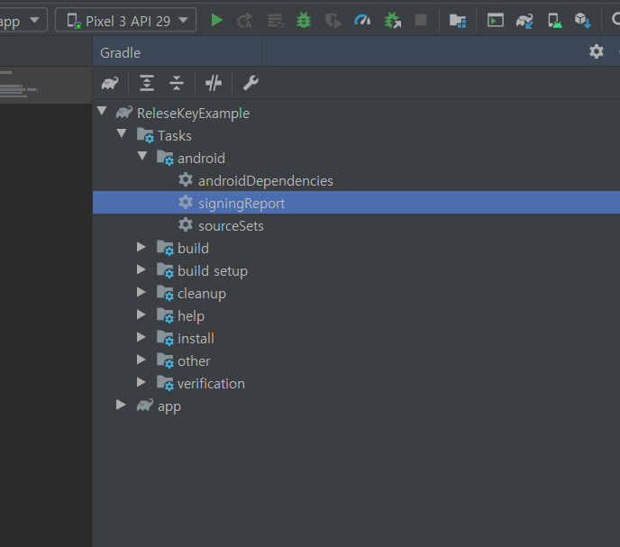 저는 귀차니즘이 있어서 더블클릭을 해서 빠르게 찾는걸 선호하는 편입니다. 처음에 터미널로 한번 릴리즈 키를 뽑고나면 확인해볼일이 없는줄 알앗는데 어쩌다 상황이 다시 릴리즈 키를 확인해야 하는 상황이 몇번 와서 아예 아래와 같이 셋팅 해놓고 Release Key를 signingReport로 빨리 찾습니다.
