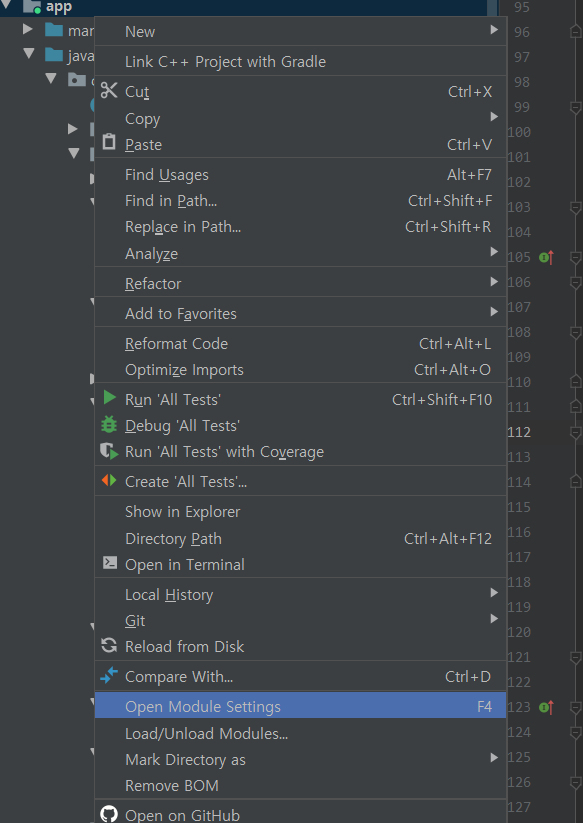 그 다음 app 모듈을 오른쪽 클릭하면 open Module Settings가 나옵니다. 눌러줍시다.