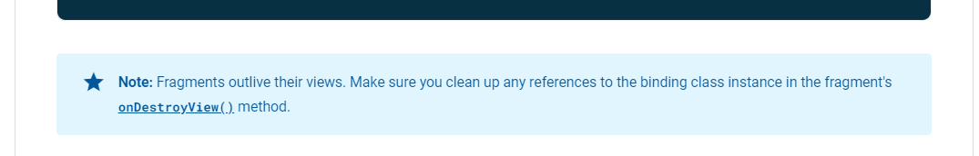 kotlin extension deprecated 이 되고나서 요즘은 ViewBinding, DataBinding을 위주로 사용하는 추세이기도 합니다. Fragment에서 ViewBinding 사용시 주의할 점이 한가지가 있는데 이에 대해 정리를 해보도록 하겠습니다.