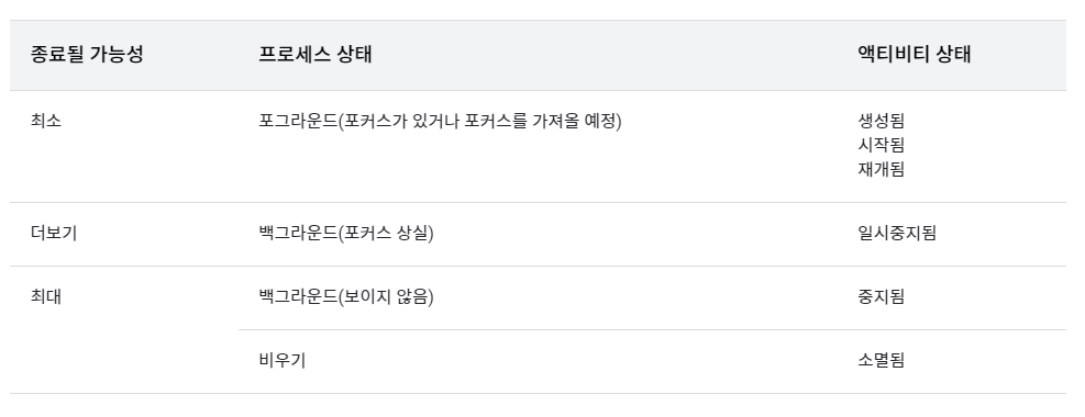 Android System 은 절대 Activity를 직접적으로 종료하지 않습니다. 다만, 메모리가 부족해지는 경우에 Activity 를 실행하는 Process를 종료함으로써 메모리를 확보하는 경우가 있습니다. 아래는 시스템이 Process를 종료할 가능성을 나타내는 표 입니다.
