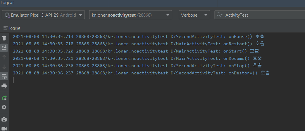 onStop에 있는 main을 다시 불러와서 onRestart가 호출이 되는것을 볼 수 있습니다.