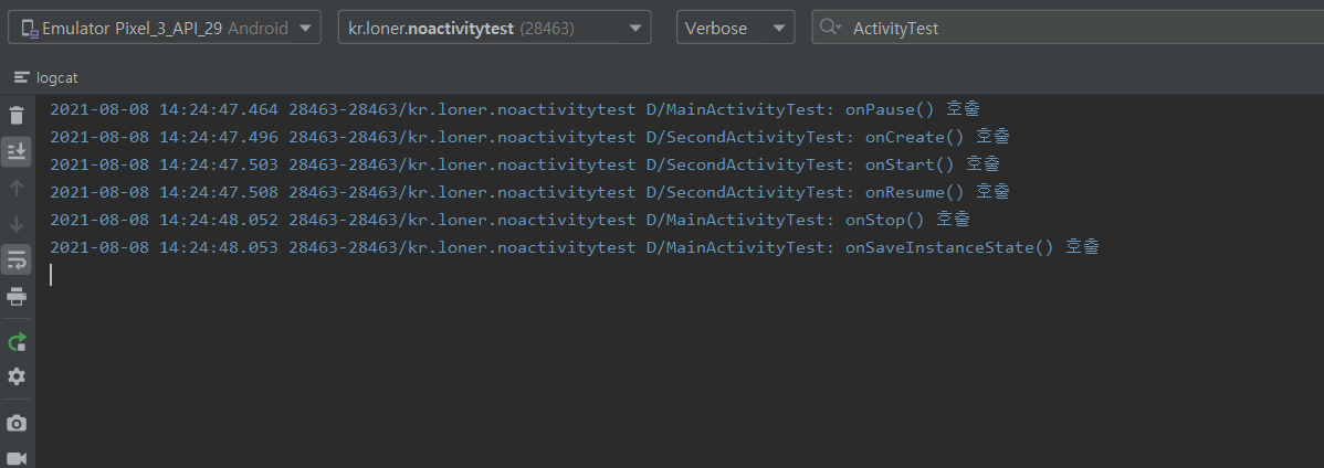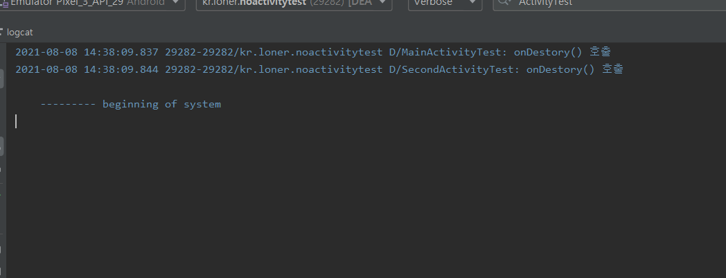 secondActivity을 보고 있는 상황에서 안드로이드 App의 Task 창에서 어플을 강제 종료했을 때 백스택에 담겻던 MainActivity까지 onDestory()가 호출이 되는 것을 알 수 있습니다.