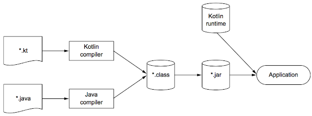 .kt 파일 생성 -> Koltin Complier에서 컴파일링 시작 -> .class 로 변환 -> .jar 파일 생성 -> Application (with. Kotlin Runtime 에 의존)